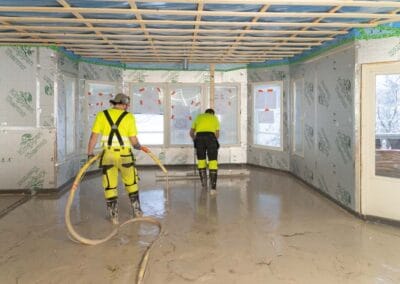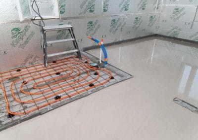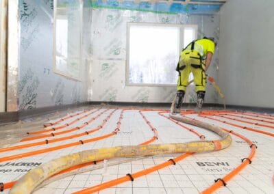 Toteutimme alkuvalmistelut ennen valun tekemistä. Puhdistimme ja tasoitimme lattian ennen lämmitysvesiputkien asennusta. Vesikiertoinen lattialämmitys jää kipsivalun sisään, jolloin saadaan miellyttävän lämmin lattia. Valua varten asensimme reunukset, jolla rajataan kipsilaastin valumista alueille, jonne kipsiä ei haluta.