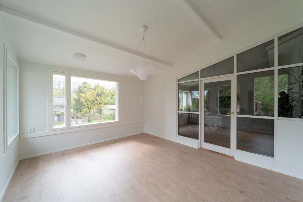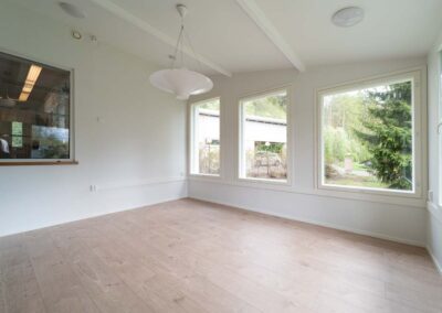 Toteutimme muutosremontin, jossa vanha viherhuone muunnettiin asuinkäyttöön sopivaksi 20 m² kokoiseksi huoneeksi. Kohteesta purettiin aiempi kasvihuoneen katto ja runko. Tilalle rakennettiin eristävämmät seinät ja katto, joka sopi talon julkisivuun. Uudet ikkunat asennettiin sekä uusi ovi talosta huonetilaan. Tilaan vedettiin myös sähköt pistorasioita ja valaistusta varten.